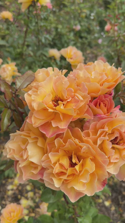 Rosie the Riveter™ is a showy floribunda rose bred by Christian Bédard and introduced by Weeks Roses in 2018. It blooms with rich orange tones softly suffused with pink and features a golden reverse on the petals. Each blossom is full — often carrying 36 to 72 petals — and typically displays in a classic, cupped to high-centered form. The fragrance is moderate, with fruity and spicy undertones.